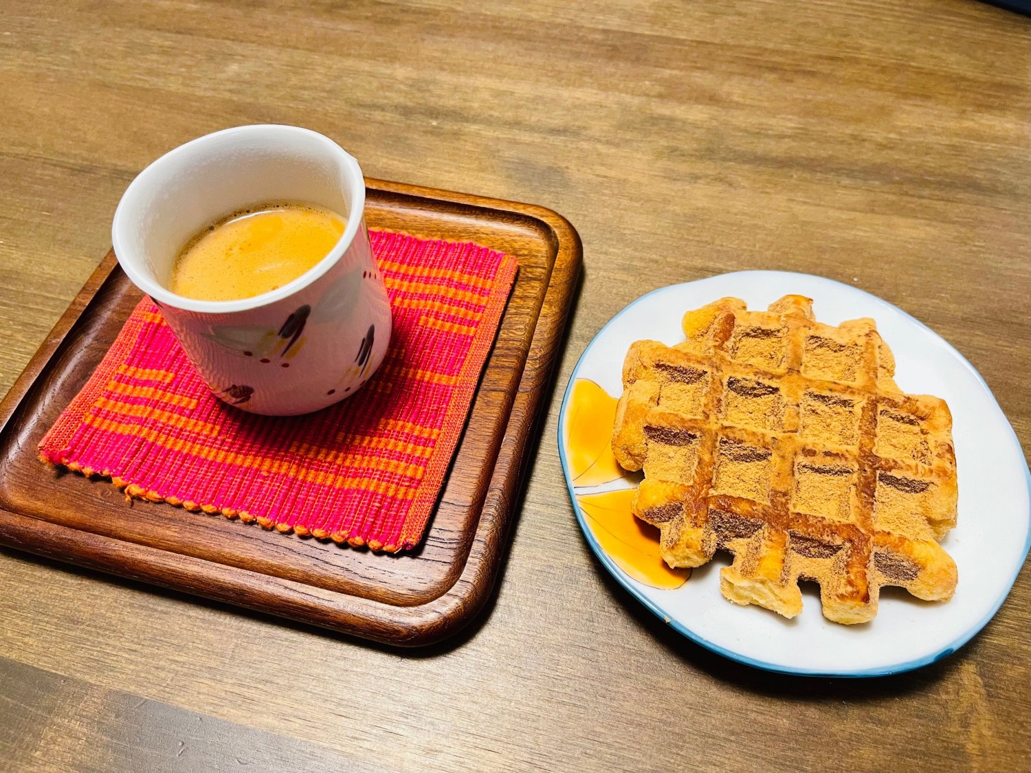 ロイヤルミルクティーを入れて、おやつは「もみの木カフェ」のベルギーワッフルを買ってきました。