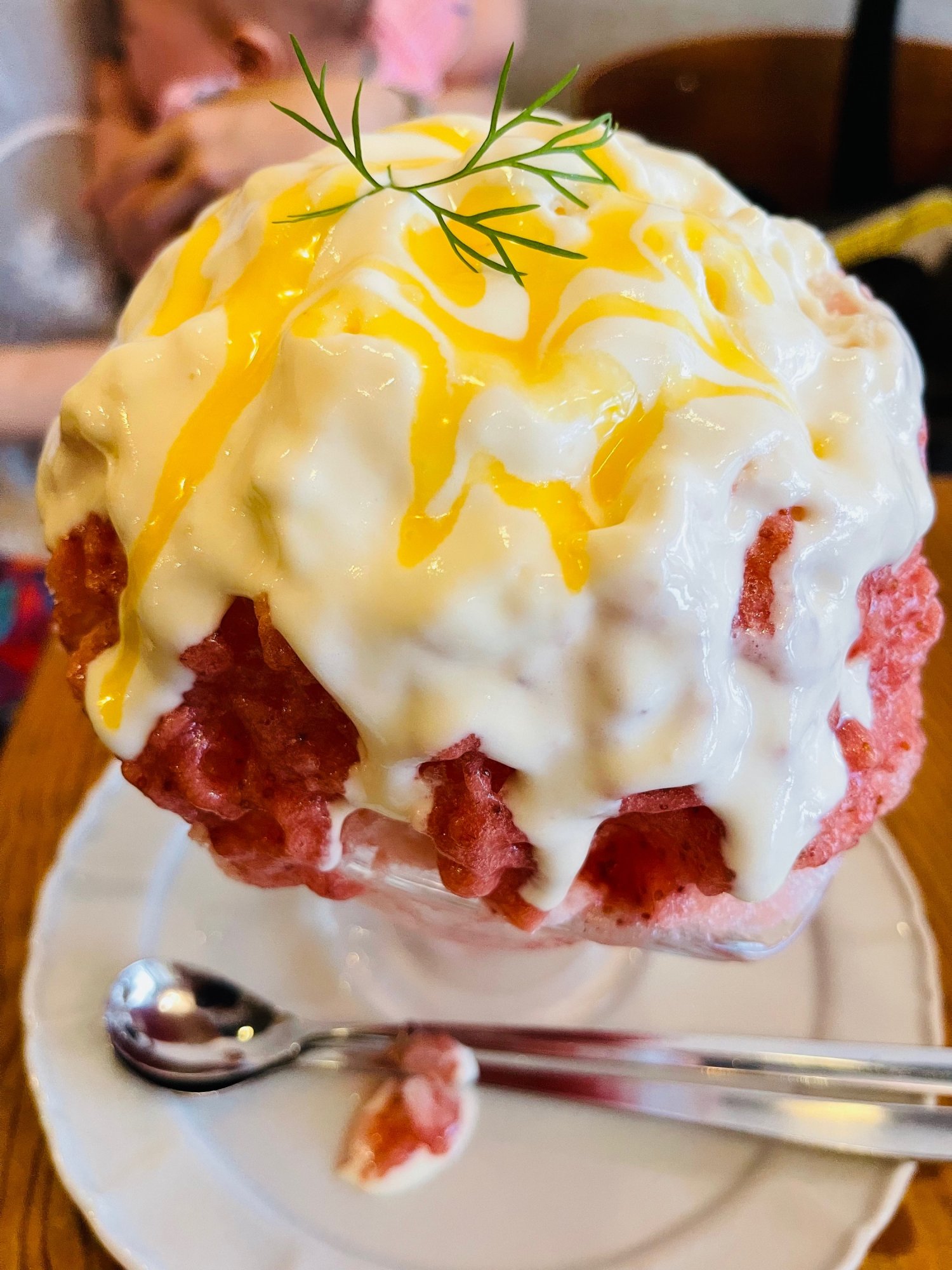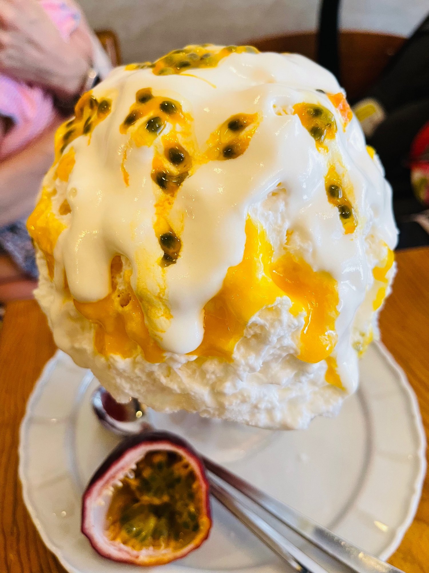 こちらは元々能登にあった人気店が、金沢の石引という町へ移転オープンしたお店です。ずっと行きたいと思ってたんですよね😍注文したのは、「生パッションマンゴーココナッツ」と「赤崎イチゴとお豆腐レアチーズソース」のかき氷。名前からして美味しそうです😋運ばれてきたのを見てみると…もうびっくり!まず見た目が丸くてデカい!上からクリームがトロ~リ!ベイビーの頭より大きいくらい😆まんまるで、とってもラブリーでした♪