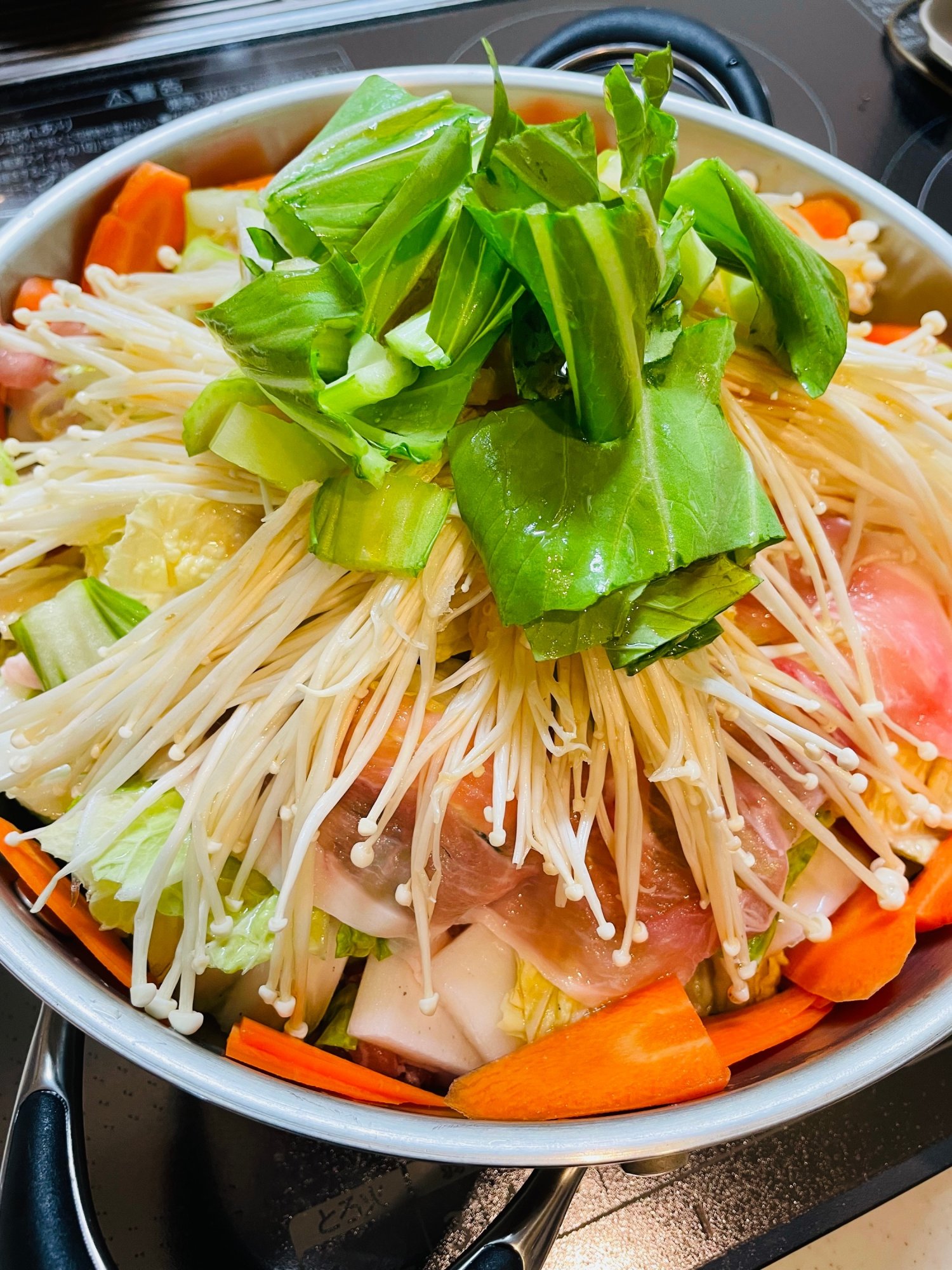 これは豚と白菜を順番に重ねてミルフィーユのようにするもの☺️うちでは胡麻油をたっぷり使うのがポイント。そこに他のお野菜もプラスするのですが、今回はエノキ茸とにんじん🥕ちんげん菜🥬をオン。火が通ったらうどんも投入してポン酢でいただきました。久しぶりのお鍋はなんともおいしかったです😍