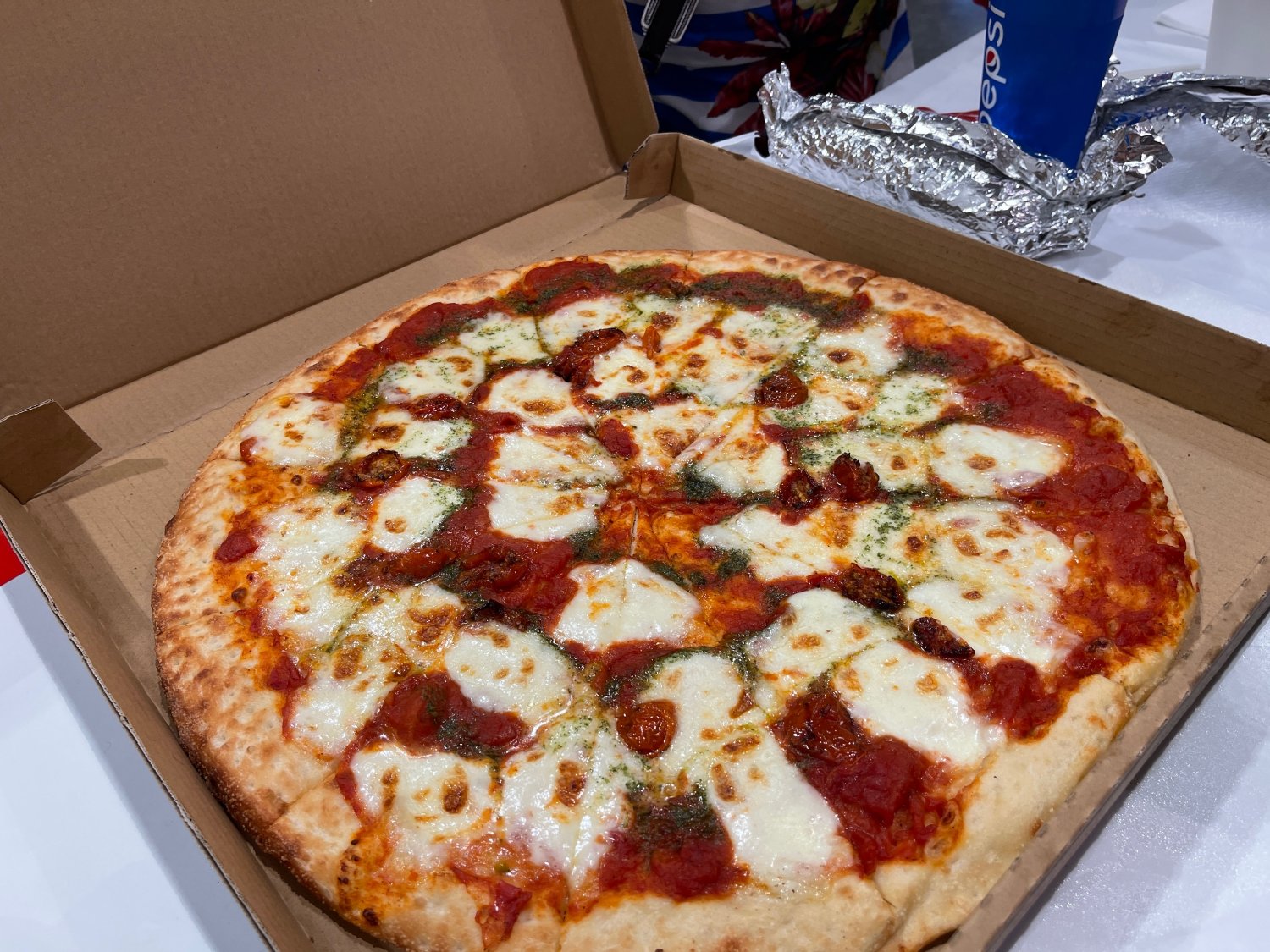 それから、コストコには人気のフードコートがあります。買い物をしたら帰りはいつもそこでホットドッグを食べるのですが、先日、初めてホールのピザを買ってみました🍕マルゲリータを選んだのですが、「どんなピザが来るのかな?」と思って待っていると、出てきたピザを見てびっくり❣️とにかくデカいんです😆