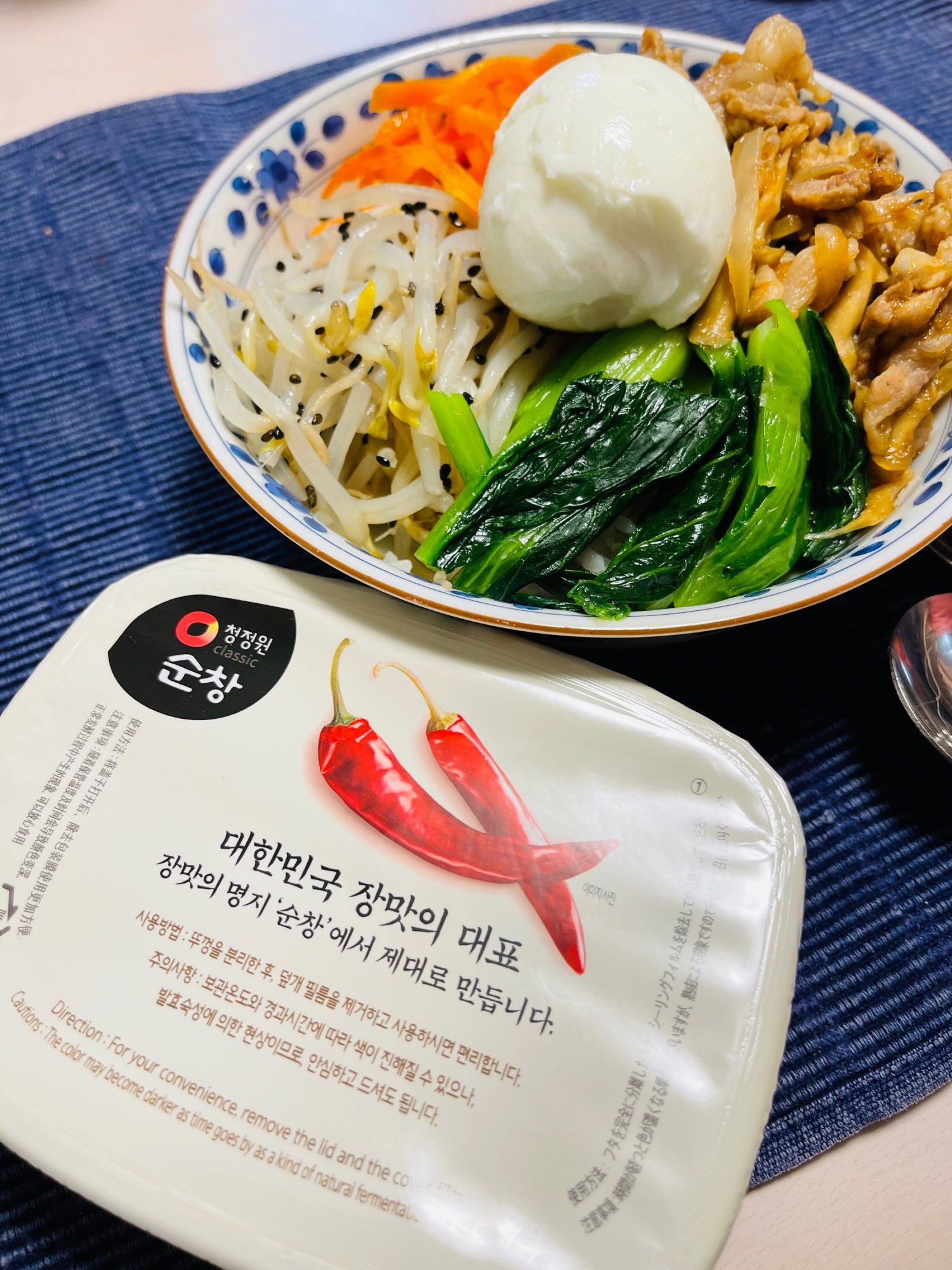 我が家ではお肉に生姜とキノコのみじん切りも入れて濃い目に味付けをしています。今回は麦ご飯にして、その食感も楽しみました。丼ぶりにご飯を敷いてナムルやお肉を並べたら、少量のごま油をかけます。そして決め手はコチュジャン🔥スンチャンというメーカーのコチュジャンがとっても辛くて美味しくてオススメでした👍