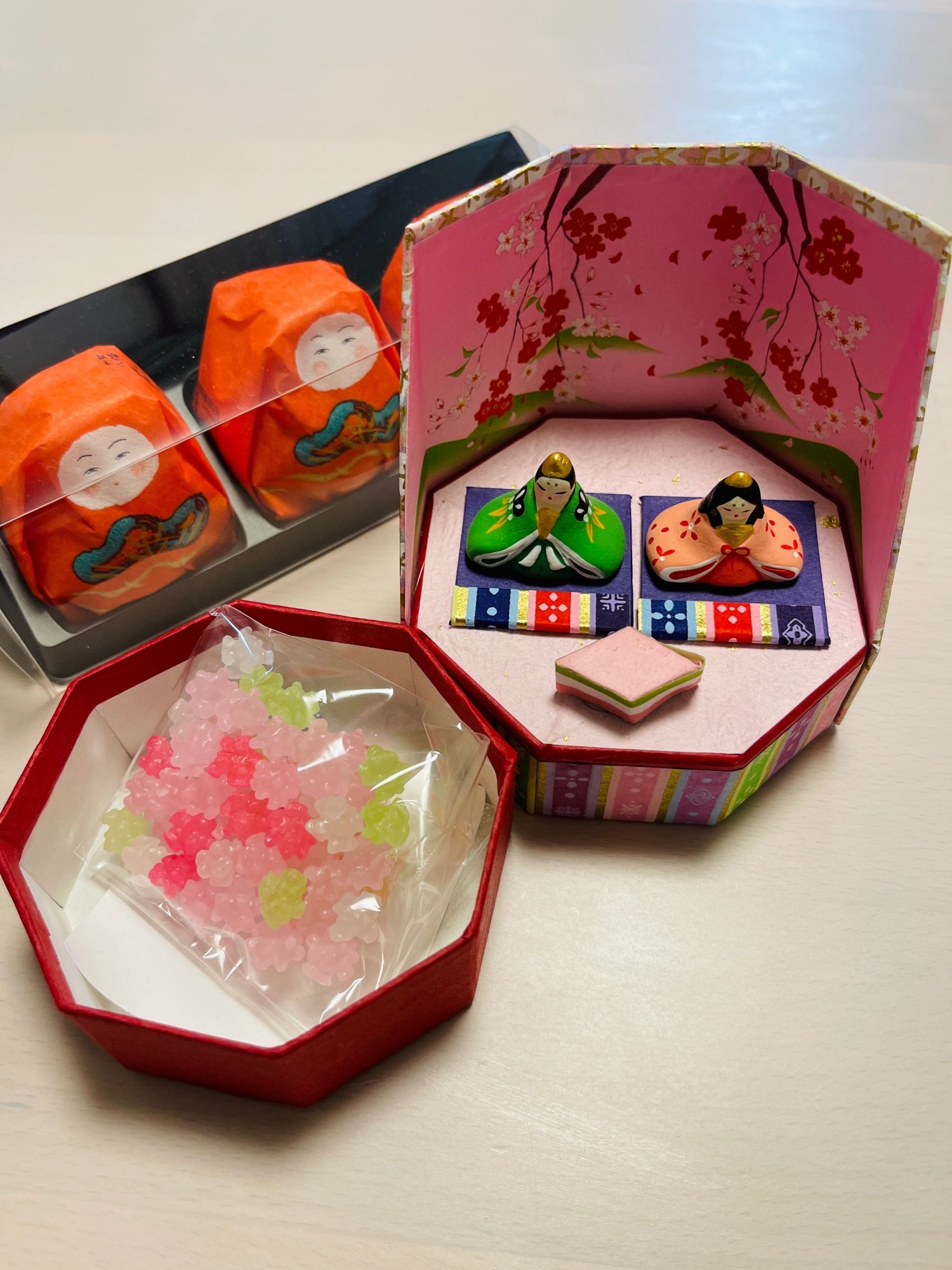 このお雛様は、下が小物入れになっていて、色とりどりの飴や金平糖が入っているのです😍家に飾ってみたら私も心ときめいてしまいました✨娘はお内裏様とお雛様に触りたくて一生懸命手をのばしていましたよ。それから、「金沢 うら田」の「加賀八幡 起上もなか」もゲットして一緒に飾り、ひな祭りをしました🌸