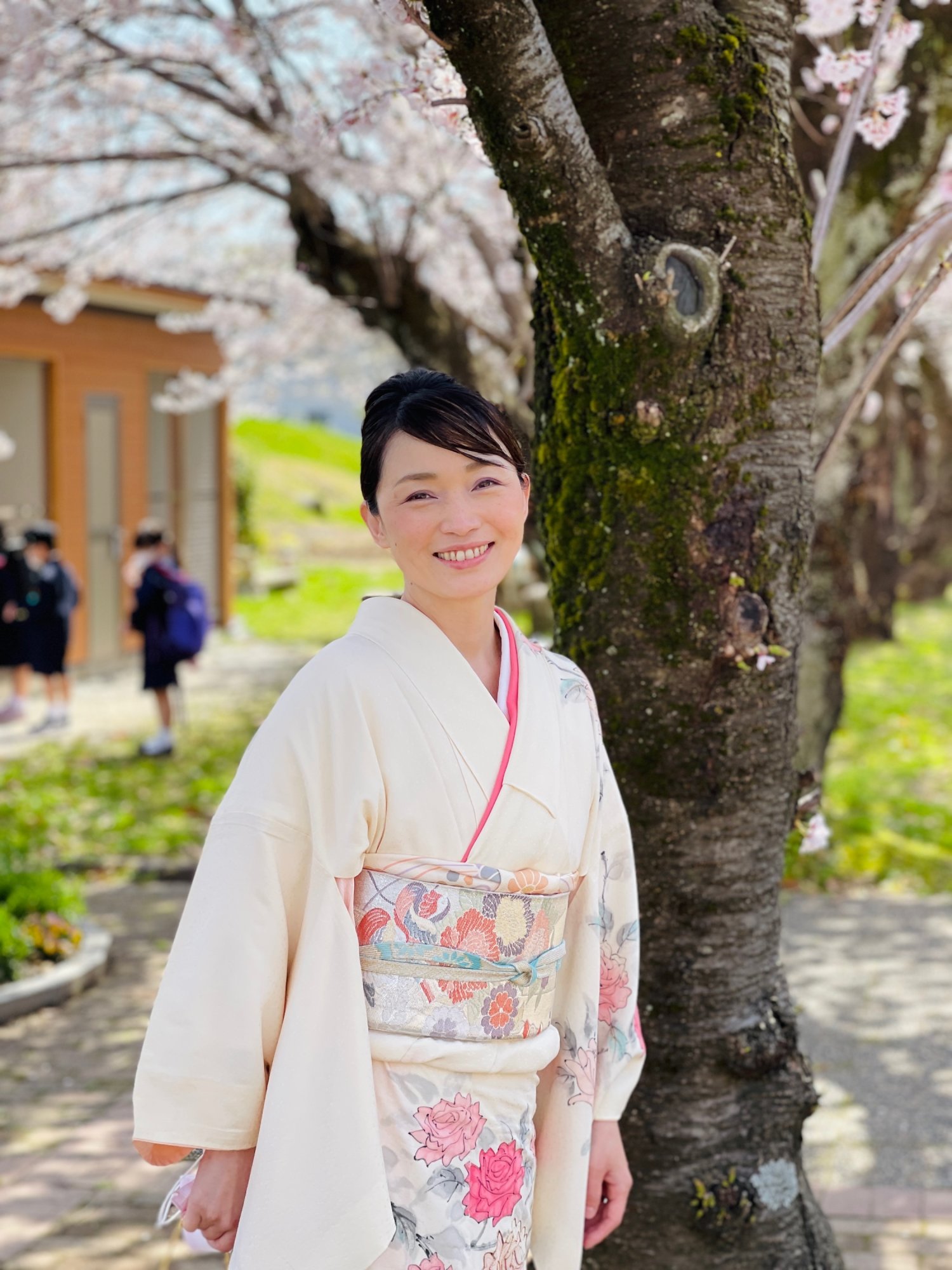 今回の着物は、私の義理の母が「入学式用に」と送ってくれたもの。クリーム色のベースに、手描きでバラが描かれているのです🌹味わいのある柄が雰囲気たっぷりでとても気に入って、私なりに小物や帯を合わせてみました😊