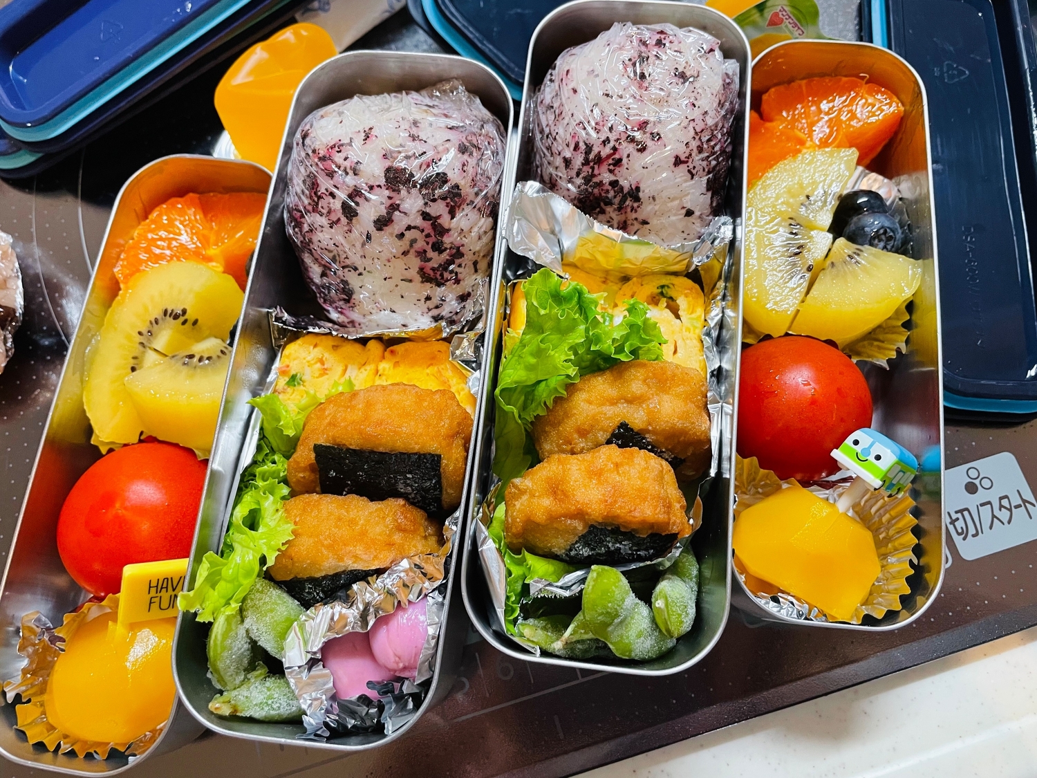 果糖が疲れを癒してくれるようにいつもよりフルーツは多め🥝🍊それから塩分を摂るために枝豆を。あと次男の好物の卵焼きも🥚長男の方にはニンニクのシソ漬けも入れてスタミナチャージです🧄必勝を願い勝ち栗にあやかって栗の甘露煮も入れました🌰長男も次男も結果はともあれ、楽しい一日になったようです✌️