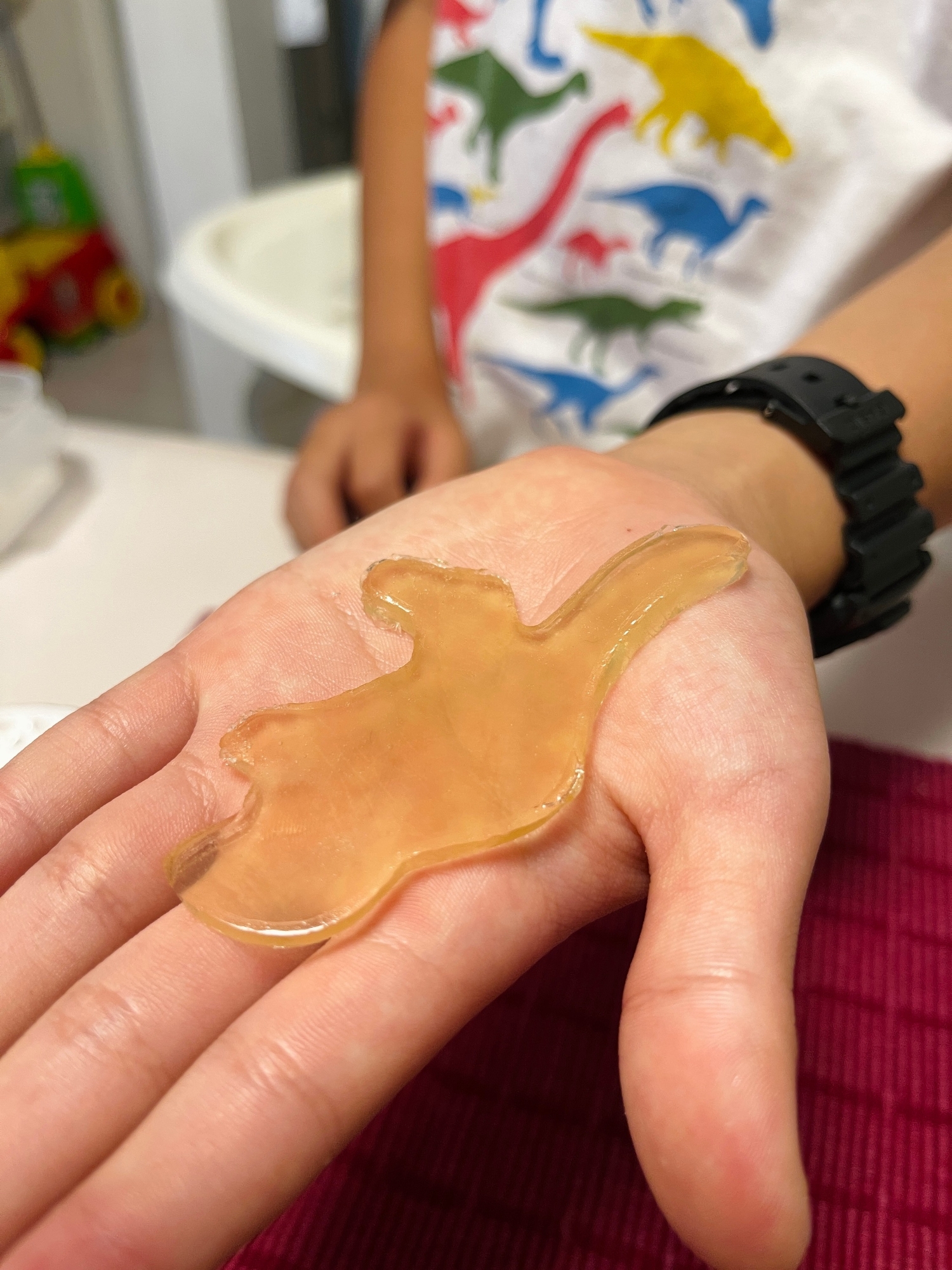 昨日は3時のおやつに「フルーツグミ」を一緒に作りました。子どもってお菓子のグミが大好き。材料は、好みのジュースと砂糖、ゼラチン、レモン汁です🍋あとは恐竜や動物などの型があればOK👍とっても簡単で、好きな形にできるから楽しいんですよね。